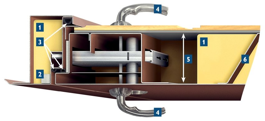 1 - non-combustible thermal insulation, 2 - hardened steel square, reinforcing the box, 3 - three continuous contours of the seal, 4 - door handle, 5 - leaf thickness 68-80 mm, 6 - stiffeners