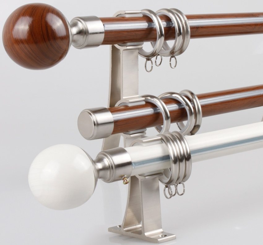 - round or tubular (the rods of such curtain rods can have a smooth, carved, embossed surface, the ends of the rod are decorated with tips corresponding in style, the designs have one or two rows);