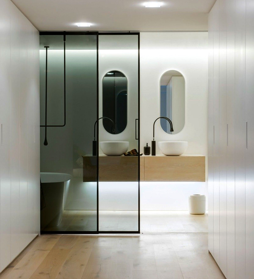 The hidden system is completely hidden from prying eyes. The mechanism can be located above the opening or be built into the door itself. Both options contribute to the expansion of space. If the hidden mechanism for sliding doors is located inside the door, only rollers and fasteners are mounted on the wall. It feels like the door is floating in the air. Such doors look very elegant and original, so they fit perfectly into a modern interior.