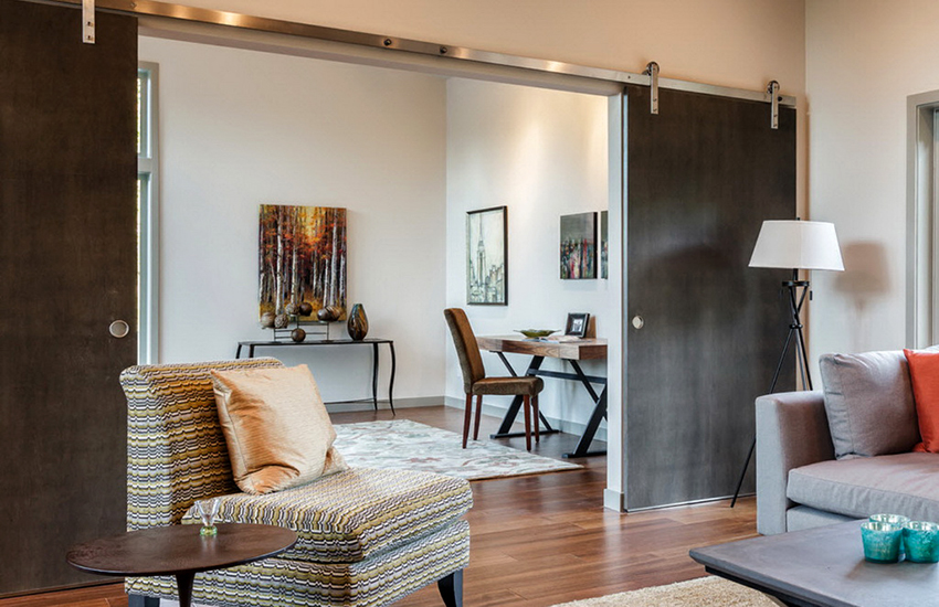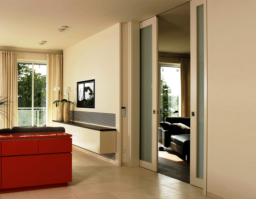 Closed sliding door systems are installed much less frequently. In this case, the door leaf is partially or completely hidden in the wall. This option can be used in the case of organizing a frame-type interior partition. She remains hollow inside, where the door can freely move, hiding in her body.