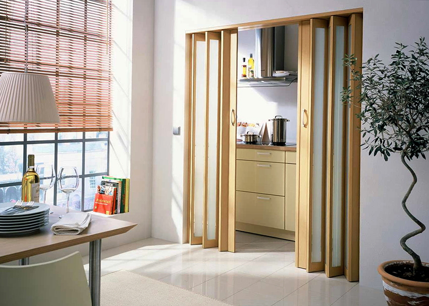 The pivot system is equipped with an aluminum profile and fasteners made of the same material for fixing the sashes. The mechanism is robust, reliable and easy to operate. Doors usually consist of two leaves and when opened, fold into an accordion, taking up space along the wall.