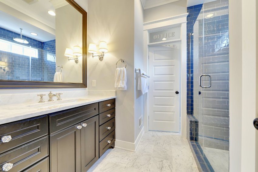 White doors with glass inserts are always sophisticated and elegant. The inserts can be made of frosted, transparent or mirror glass. These doors will complement the classic style well. The versatility of white doors is that they fit any room, be it a bedroom or living room, kitchen or bathroom. The modern design of the door handles is favorably emphasized on the white model.