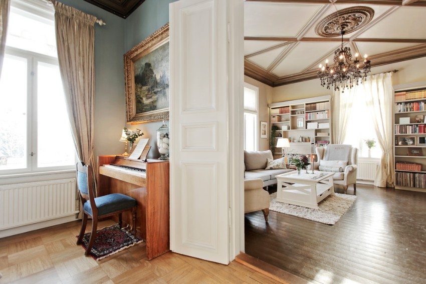 Many city dwellers decorate their apartments in country or Provence style. Interiors of this style are characterized by associations with nature, warm summer days, flower gardens, and rustic motifs. In the country style, the emphasis is on natural furnishings, rustic textiles and dried flower decor. Hinged doors made of natural materials (or imitating them), with a pendulum mechanism, warm tasty shades are suitable for this style. It is better that the door handles and fittings on Provence or country style models have an aged look.