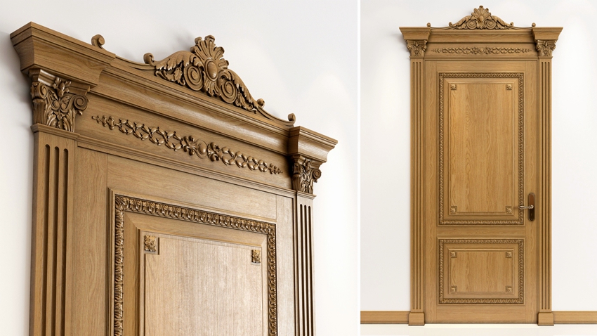 - embossed or curly door trims, photos of which surprise with a special design. In their manufacture, wood of valuable species is used, which allows you to accurately convey the shape, however, this significantly affects the cost of the product;