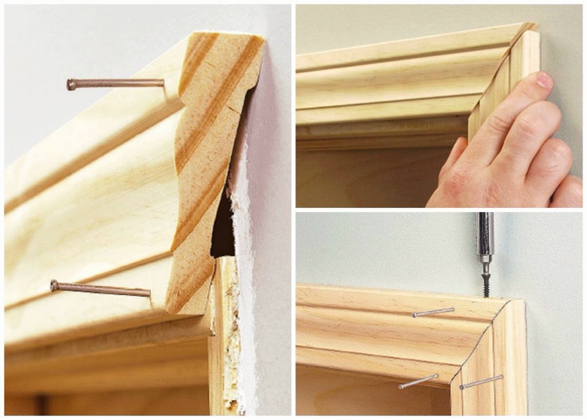 The first way implies the use of finishing nails. It is easiest to nail the casing made of wood or MDF with nails without hats. At the same time, the mount is reliable, but if necessary, it can be quickly dismantled. Before you nail the platbands onto the interior doors, you need to choose the right size of finishing nails. It is calculated individually, taking into account the thickness of the platbands. The optimal length is 40 mm, since after passing through the bar, the stud must enter the body of the box by at least 20 mm.