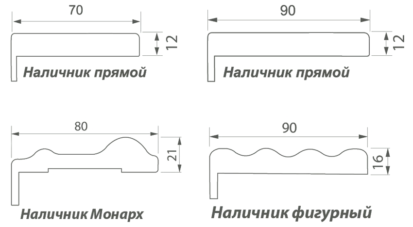As mentioned above, trims for interior doors in shape can be flat, semicircular, rounded or embossed. A separate category is cashing in the form of a capital, where the upper part has a special decorative shape. Depending on the method of installation, they can be overhead, which are fixed with special nails, as well as telescopic with mounting ridges, which are inserted into the grooves of the door frame.