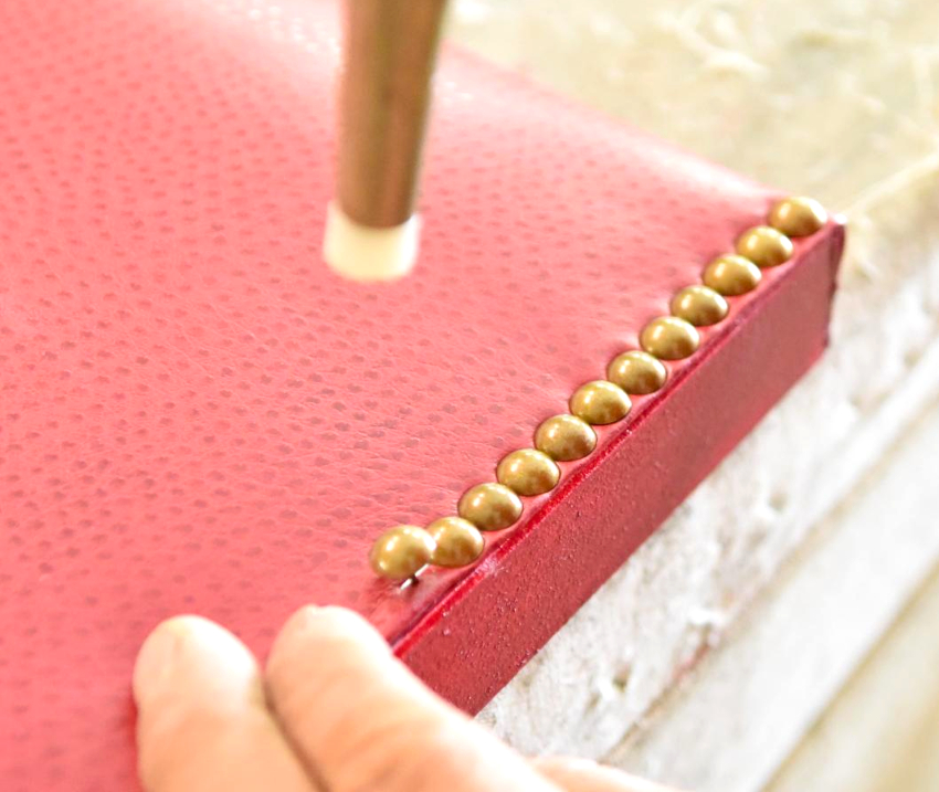 The main problem is the use of nails with decorative heads. MDF is a dense material, to hammer nails into it, you need to make an effort. Hitting the cap can damage the aesthetics of the cap. The most acceptable option is to use a pneumatic gun to drive nails instead of a hammer. The tool is quite expensive, it is impractical to purchase it to decorate one door, but you can rent it for a short period of time at a very reasonable cost.
