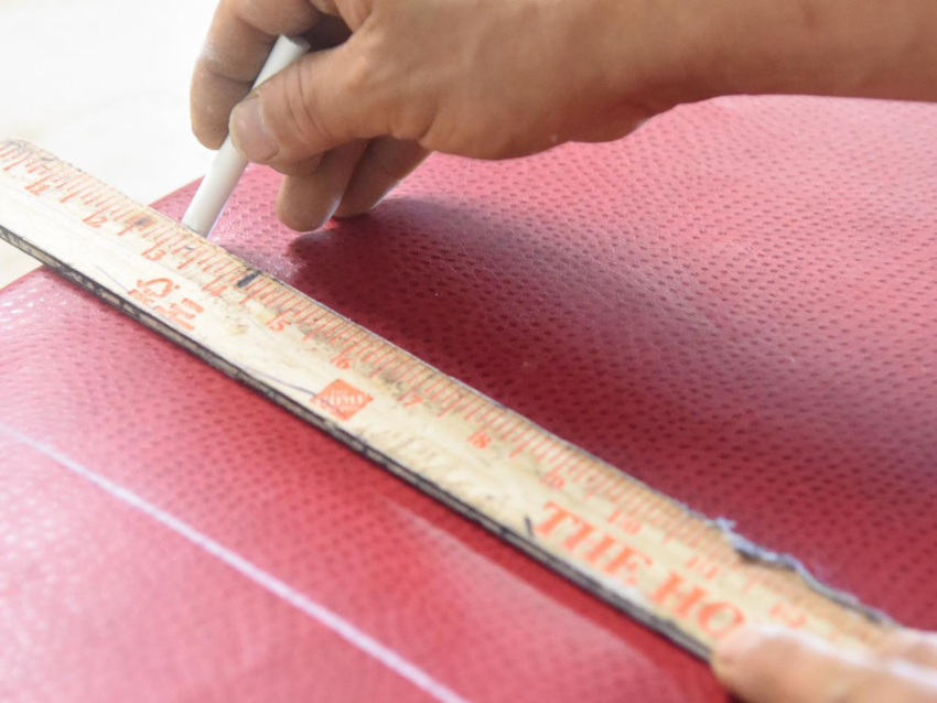 Measurements of the canvas are carried out, a calculation is made. The piece of leatherette should be larger than the size of the door, so that a margin of at least 3 cm is formed on all sides. It is necessary that the foam or isolone lining is 0.2-0.4 cm smaller on all sides than the door leaf. When plowing externally in the hinge area, an additional indent should be made.