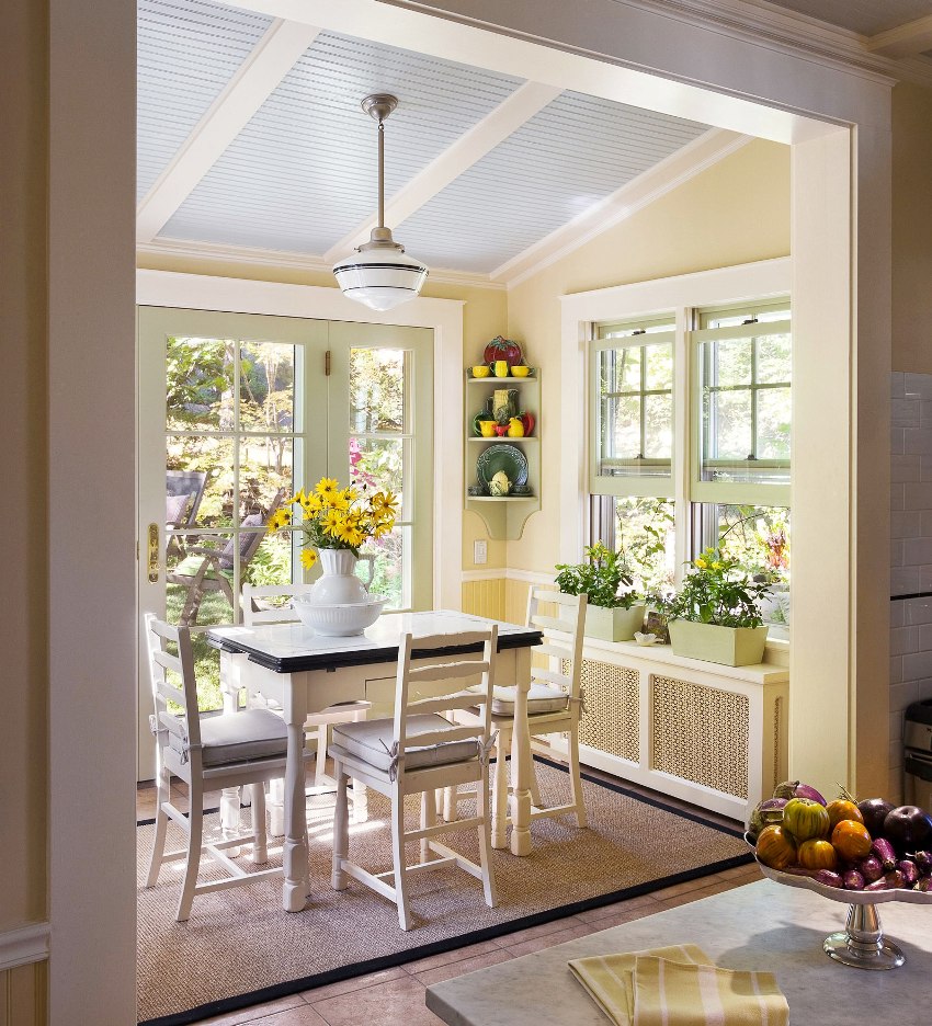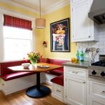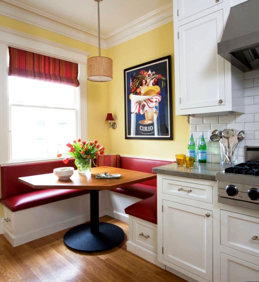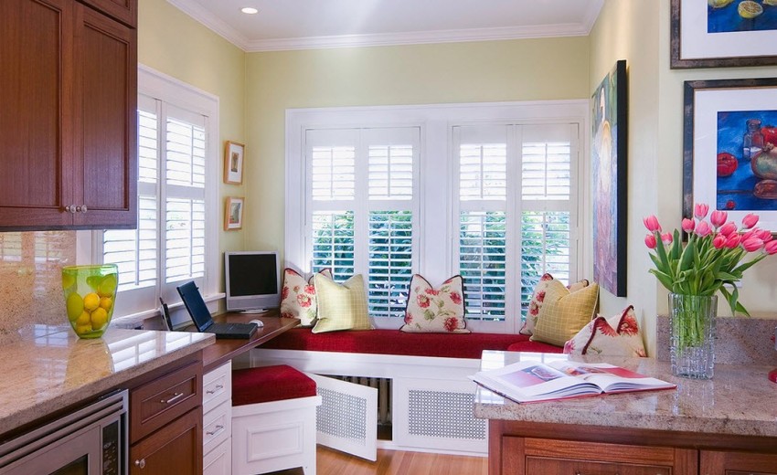 You can often find photos of kitchens, near the window of which there is a cozy and comfortable seating area. Placing the so-called lounge area on the windowsill adds personality to the kitchen and decorates the window area. This decor option can be used both in a large room (then you can use additional furniture elements), and in a small kitchen, which has a wide window sill.