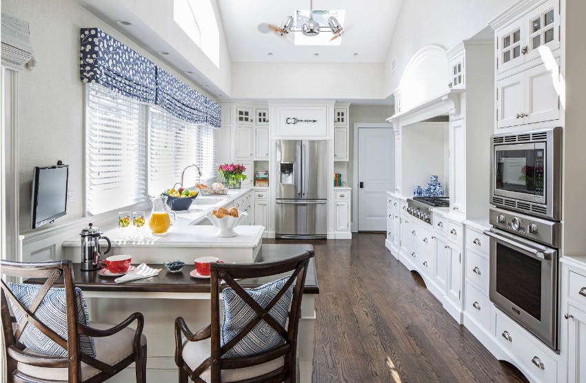 Luxurious curtains are considered a traditional design option for a window opening, be it a kitchen or another room, especially since you can find a large number of options for colors, prints and material from which they are made in retail outlets. The main advantages of using curtains to create a kitchen interior include the following: