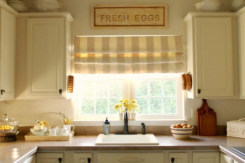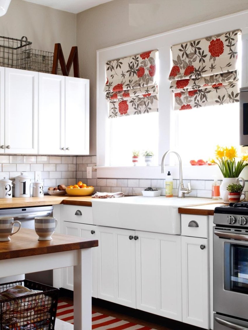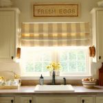 - In a narrow kitchen, Roman or roller blinds with horizontal stripes look organic.