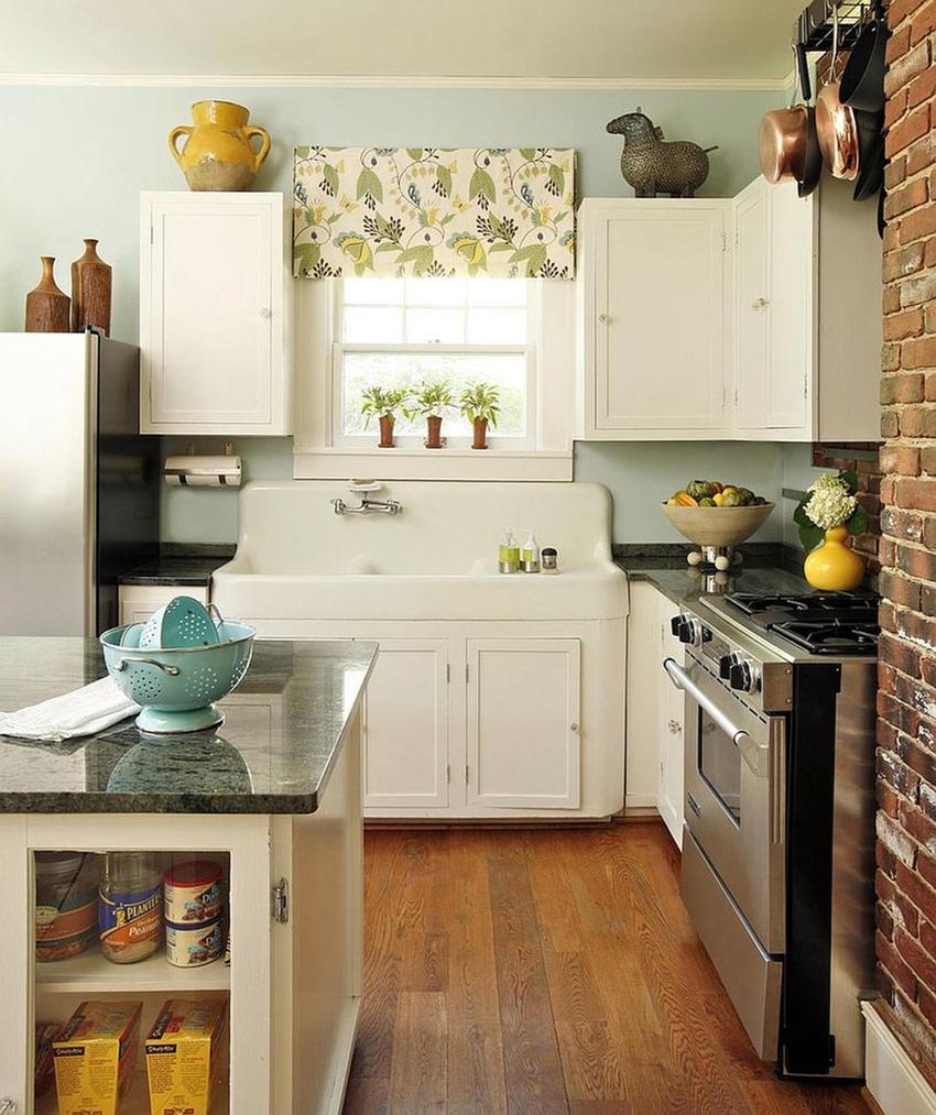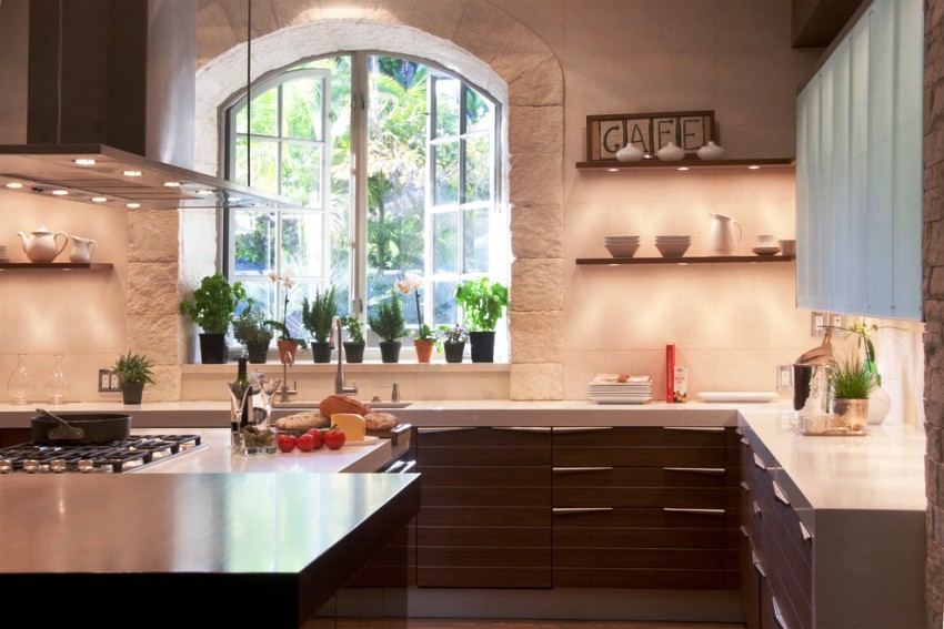 The classic way to decorate a window in a kitchen is to decorate a window sill with houseplants. Correctly selected flowers can not only emphasize belonging to a particular style, but also make the interior harmonious. In the warm season, if possible, flowers can be displayed on the window from the street side.