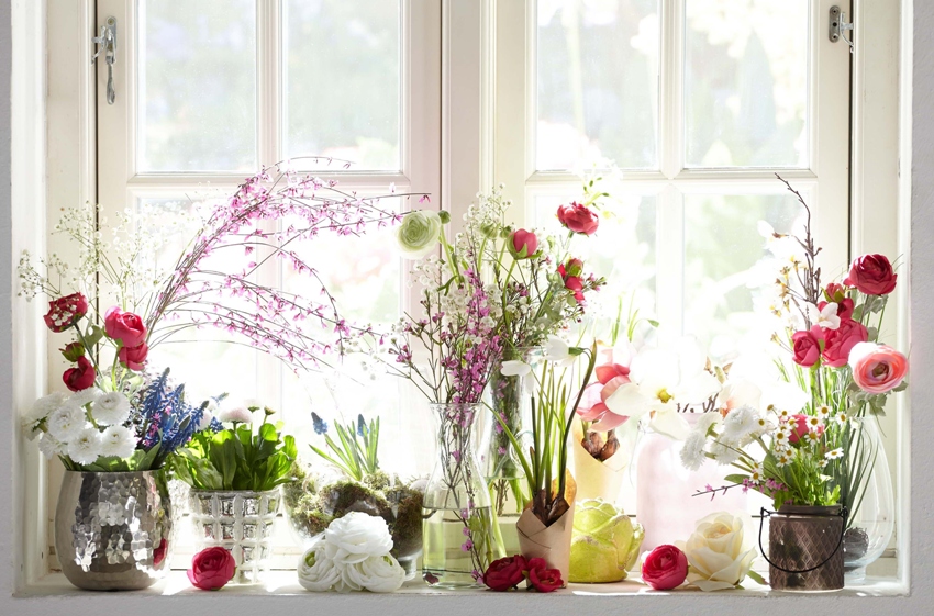 The use of fresh flowers on the windowsill: photo window decoration