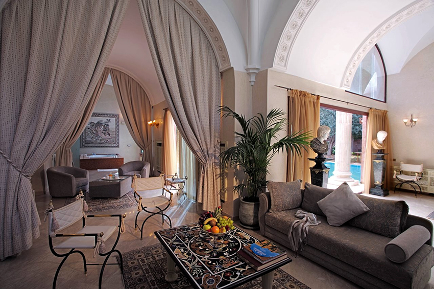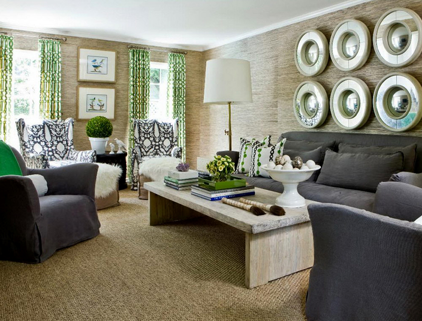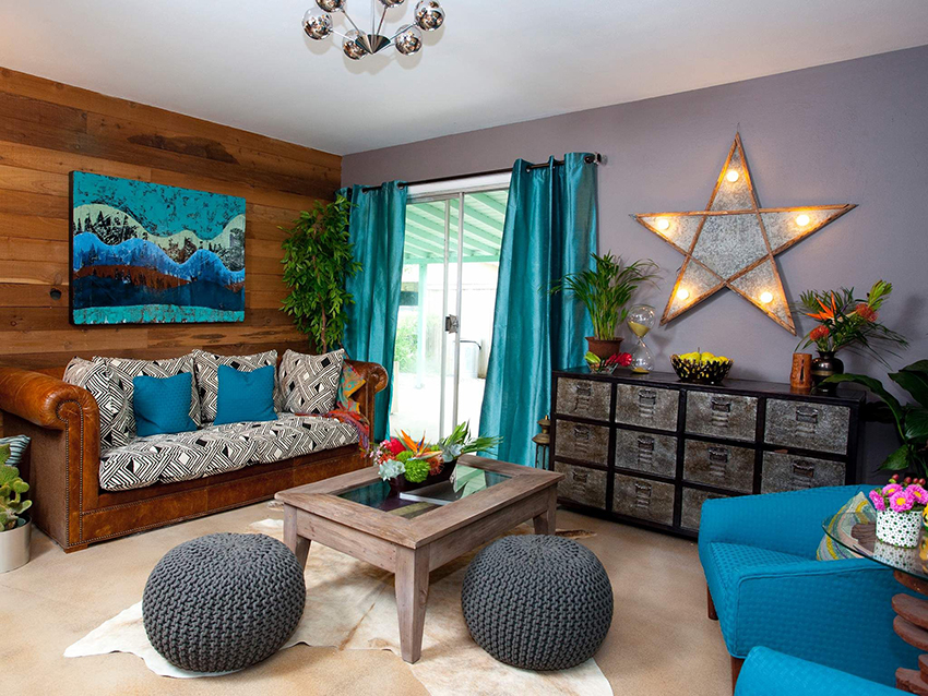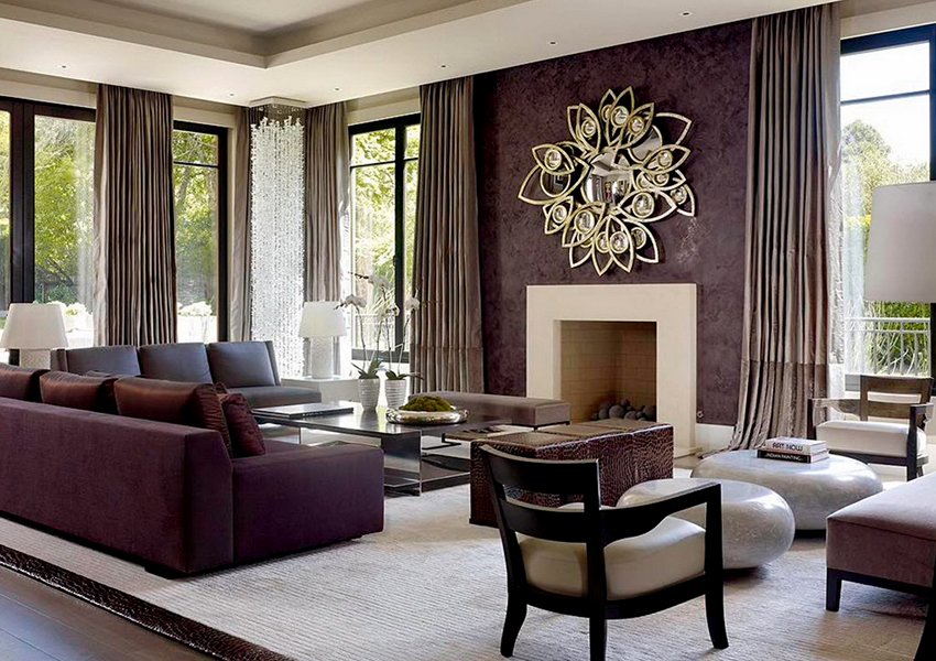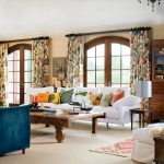 The combination of fabrics of different textures and colors, the use of multilayer structures, the use of brushes for decoration, fringes allow you to diversify the interior of the living room, make it unique.