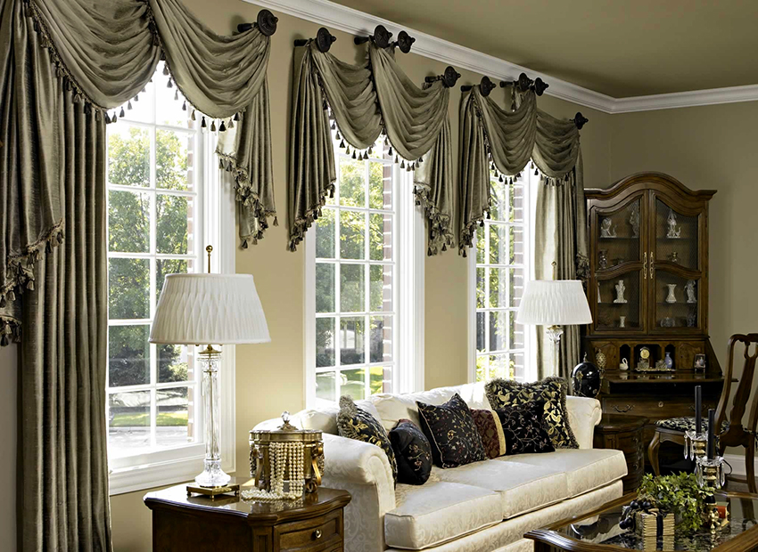 Decorative design of curtains: lambrequins, frills, drawstrings, hooks