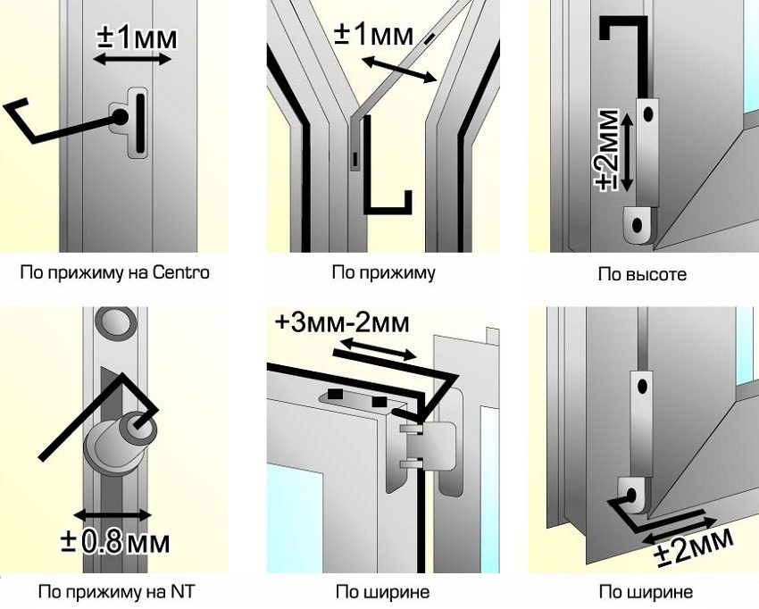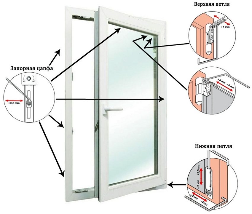 Usually the sash sagging occurs when the window is in the open position for quite a long time or when it is suddenly opened / closed. If the sash touches the vertical lower or upper part of the striker, the skew can be eliminated by adjusting the hinges of the plastic window. When the window is open, the upper canopy is adjusted: turning the key clockwise, the sash will move to the right, and vice versa.