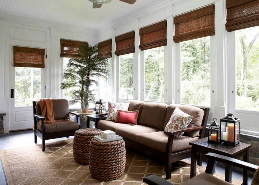 Dimout sun blinds allow some light to pass through, while retaining heat. This type is often used for shading living rooms and offices. This is ideal for mini greenhouses and conservatories, as shown in the photo. Cost of horizontal jalousie on the windows is an average of 700 rubles. Products made of special blackout fabric, due to their multi-layering, completely protect the room from the penetration of sunlight. These curtains are ideal for nurseries, bedrooms, conference rooms and cinemas. The average cost of roller blinds for windows is 900 rubles.