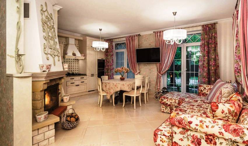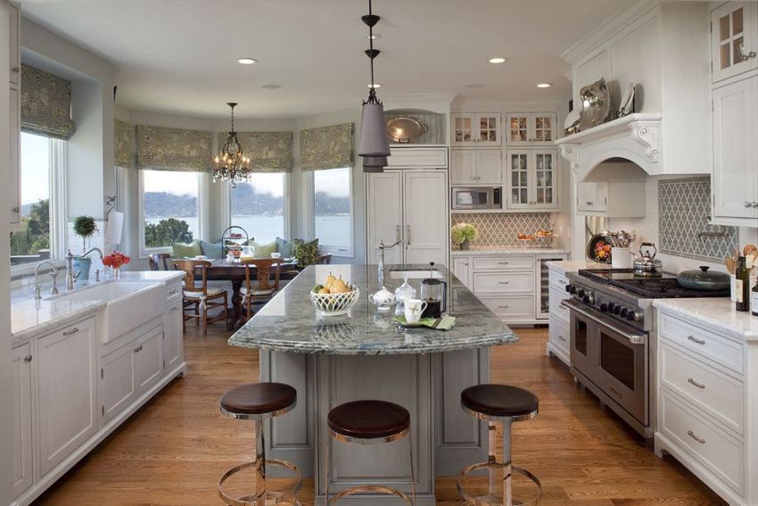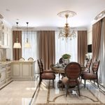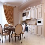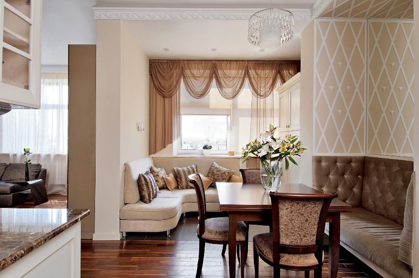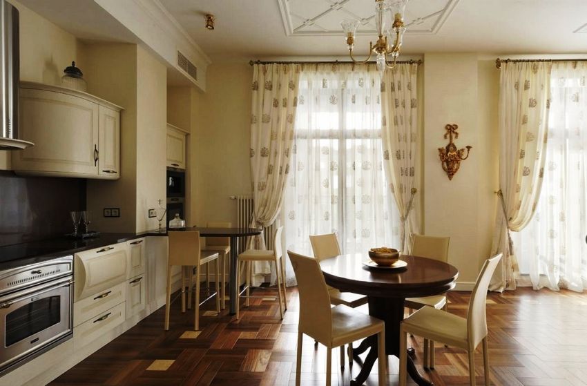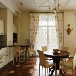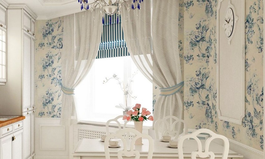 If you look at the photos of the designs of the curtains for the kitchen, then you can notice that the Austrian curtains are something between Roman and French models. In terms of the lifting mechanism, they do not differ from the Roman version, and the lush drapery makes them look like French curtains. Austrian models will perfectly fit into the classic interior of a spacious living room combined with a dining room. Such products will make the room graceful and solemn, especially if the room has a bay window.