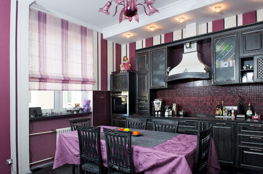 - The size of the kitchen space. The design of the curtains for the kitchen is selected taking into account the dimensions of the room. For example, if you want to visually expand the area, you need to choose a pattern with transverse stripes, and if the goal is to increase the height of the ceilings, then vertical stripes on the curtains will look best.