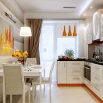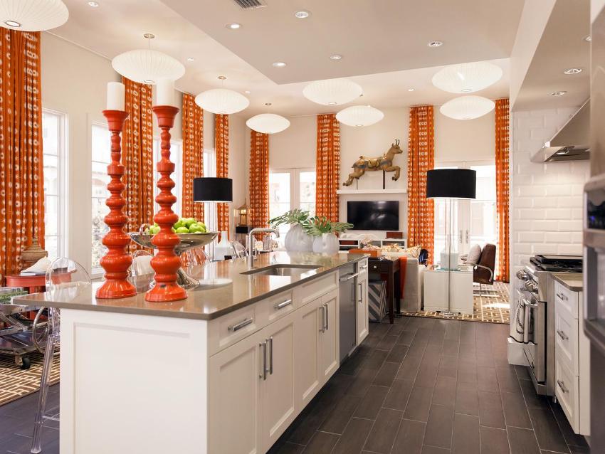 Curtains should be an independent decorative element. In this case, the curtains act as a bright accent in the room and stand out significantly from other surfaces. For example, orange curtains look original, which emphasize the kitchen, decorated in light white.