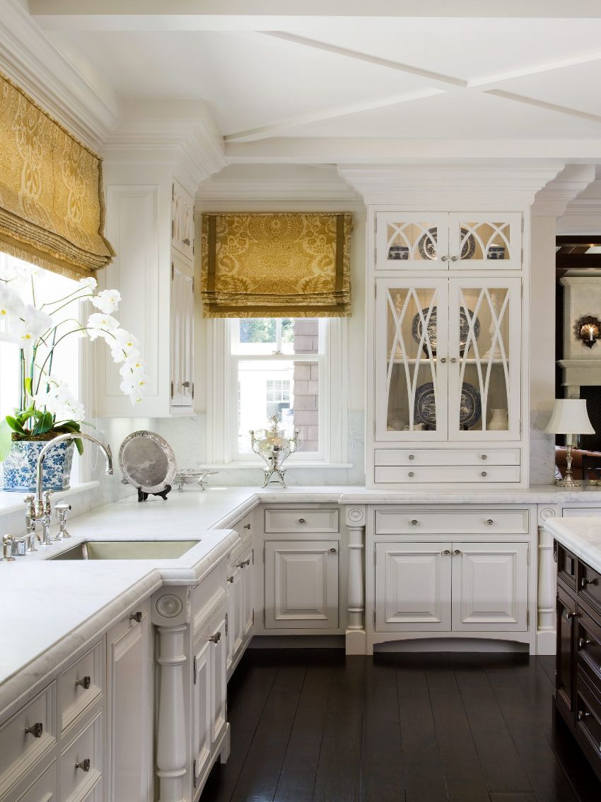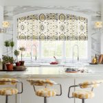 The convenience of Roman curtains is that they are easy to adjust in height, this allows you to control the flow of sunlight into the kitchen. There is also the possibility of installing additional decor, such as tassels, braids, scallops and fringes.