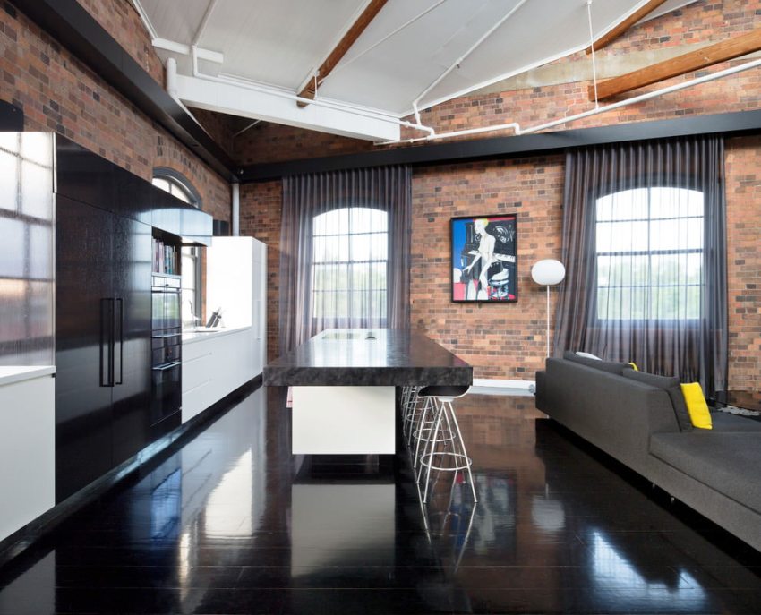 If the room is made in muted pastel shades, then you can hang darker curtains, which will add originality to the kitchen
