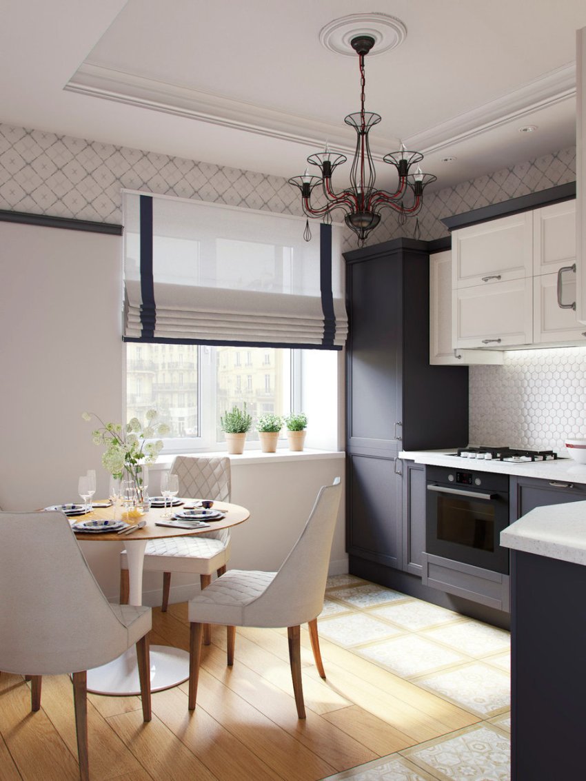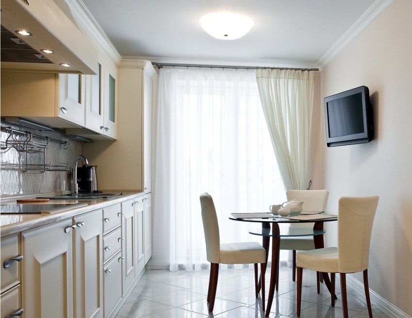 - The shape and overall area of the kitchen. In addition, the width of the window frame and the height of the ceilings are taken into account.