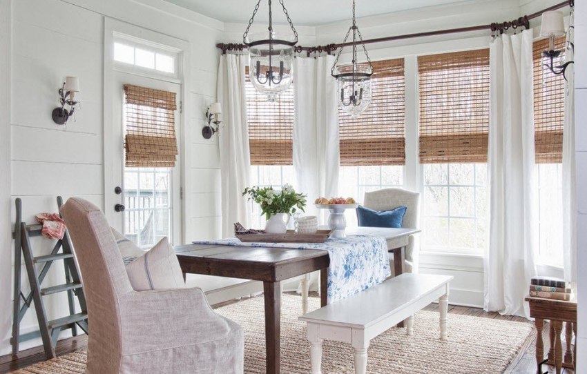 Bamboo curtains are considered unusual and add some exoticism to the interior. They are made from bamboo cane, jute straw or natural fabrics. The curtains do not take up much space, they are very light, and most importantly, they are moisture-resistant. It is especially popular to use a combination of natural linen curtains or lightweight tulle fabrics and bamboo panels.