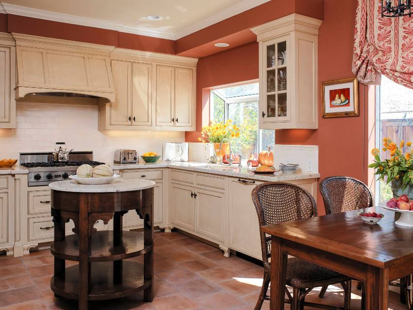 A contrasting color against the walls is preferred. The curtains in the kitchen should not match the color scheme with vertical surfaces, otherwise they will simply dissolve against the background of the walls. That is why the curtains should be several shades darker than the surrounding surfaces. For example, such combinations as black and white, yellow-green, red-blue, brown-milky colors look good in the interior.
