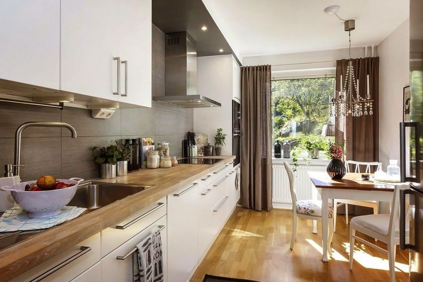 - The amount of light. The degree of illumination of the room depends on which side of the world the kitchen goes to. Based on this criterion, the density of the fabric for curtains is determined.