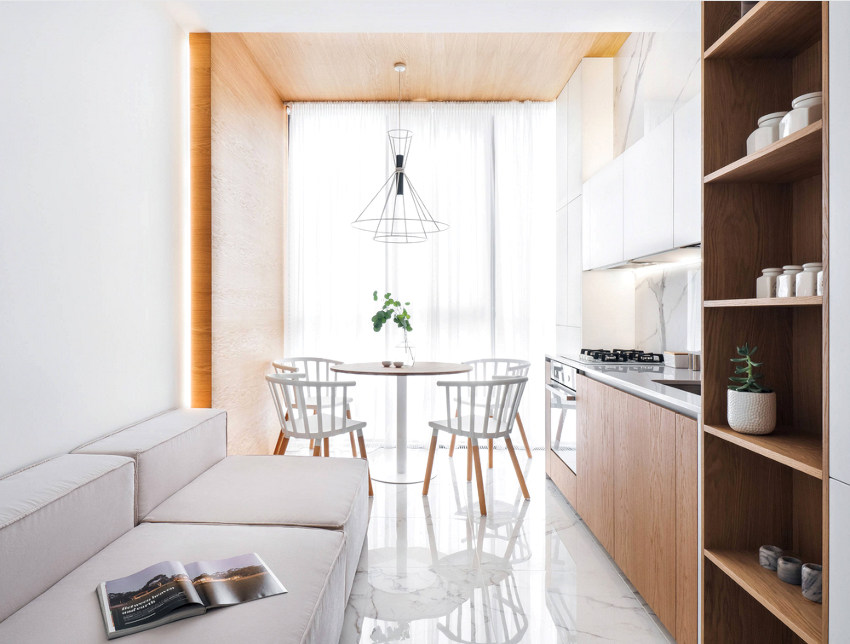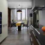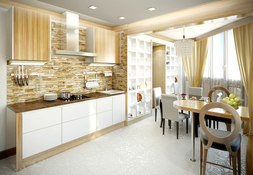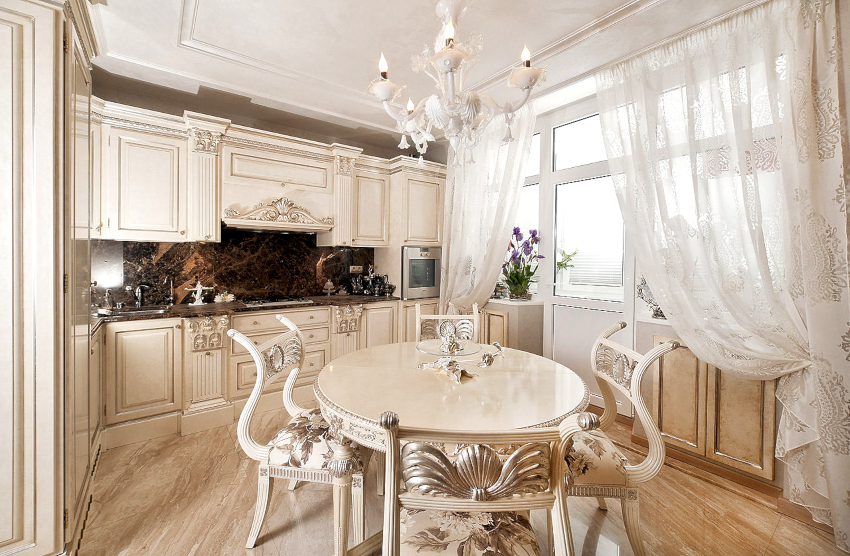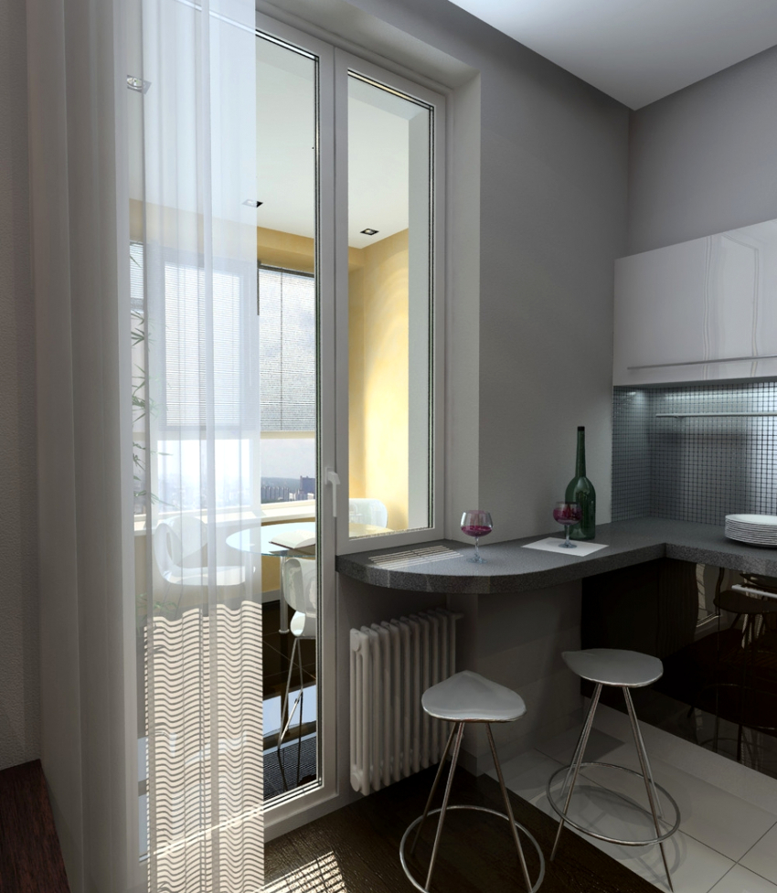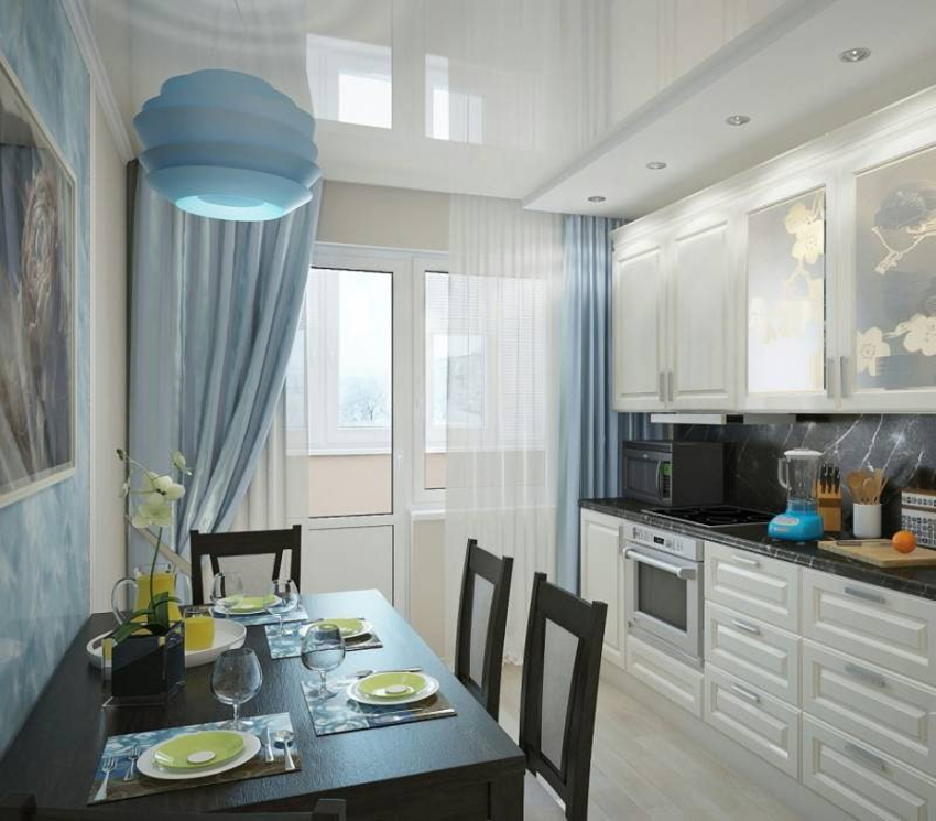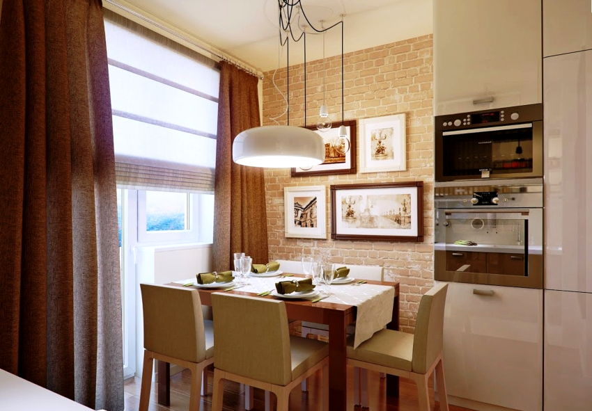 In this room, it is important to leave light not only the work area, but also the dining area. Therefore, when choosing curtains for a kitchen with a balcony, you should give preference to light transparent fabrics that match in color with pieces of furniture and help create a joyful mood.