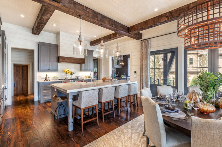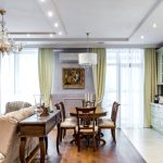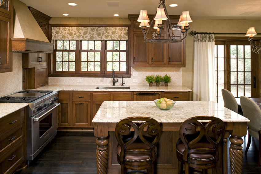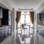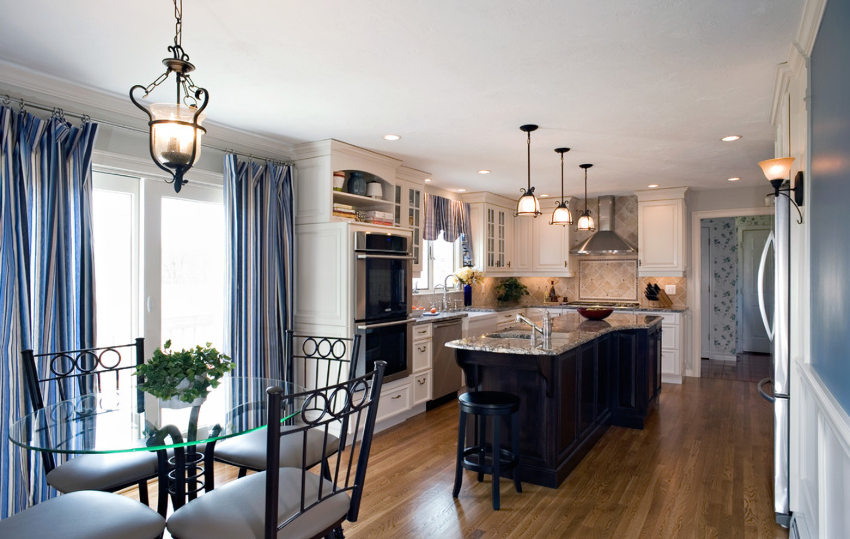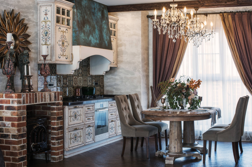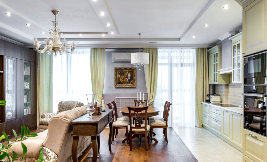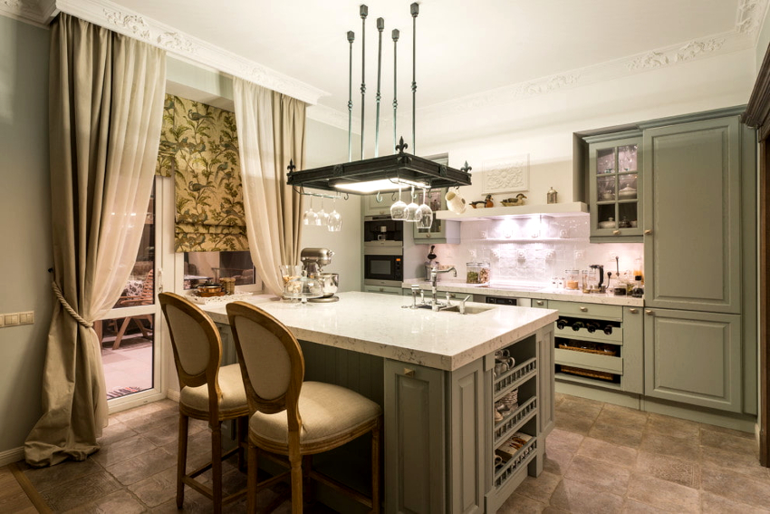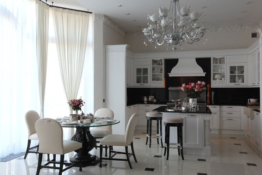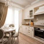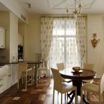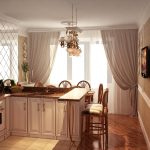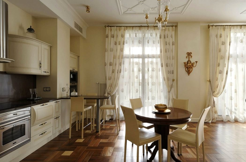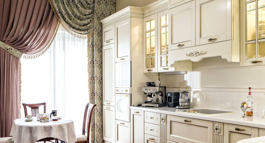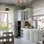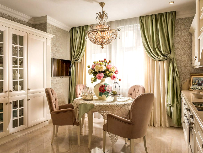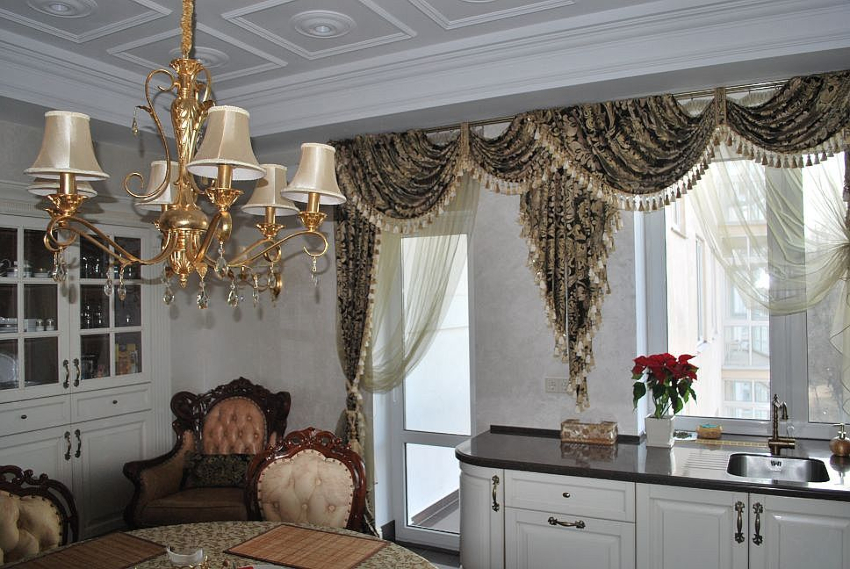 If the option of decorating the kitchen in a classic style was chosen, then in this case it is appropriate to hang lush double curtains