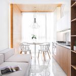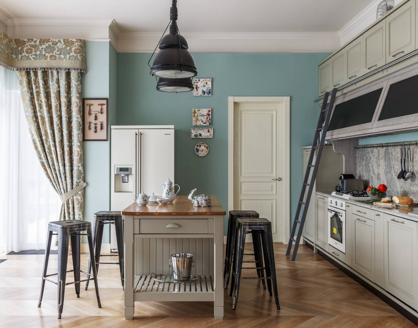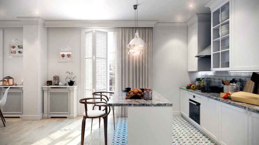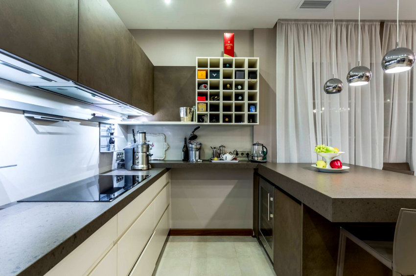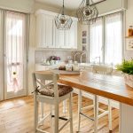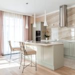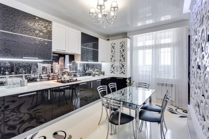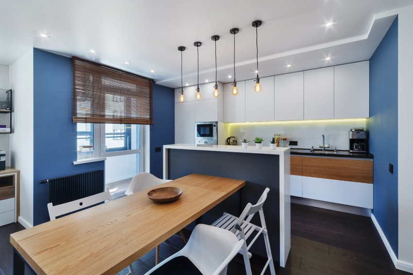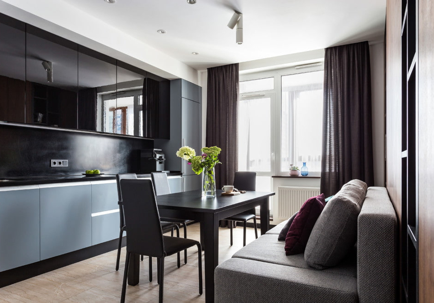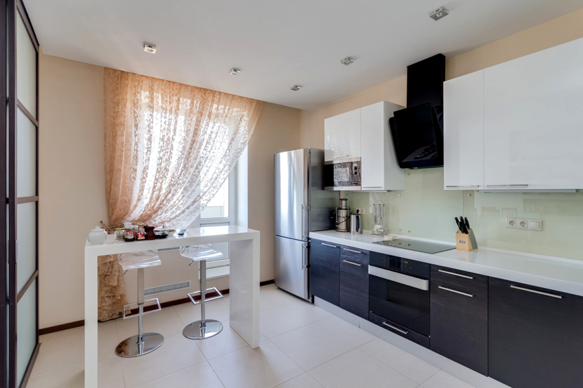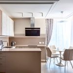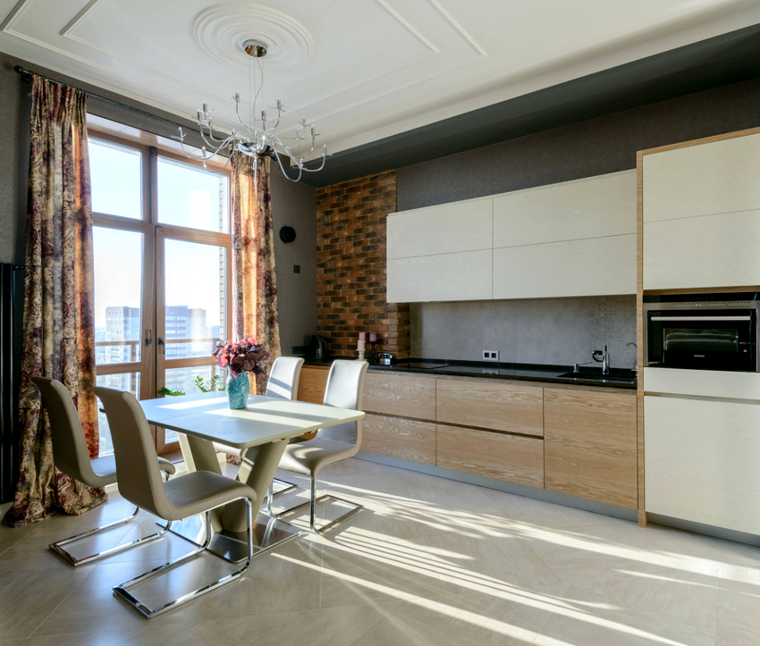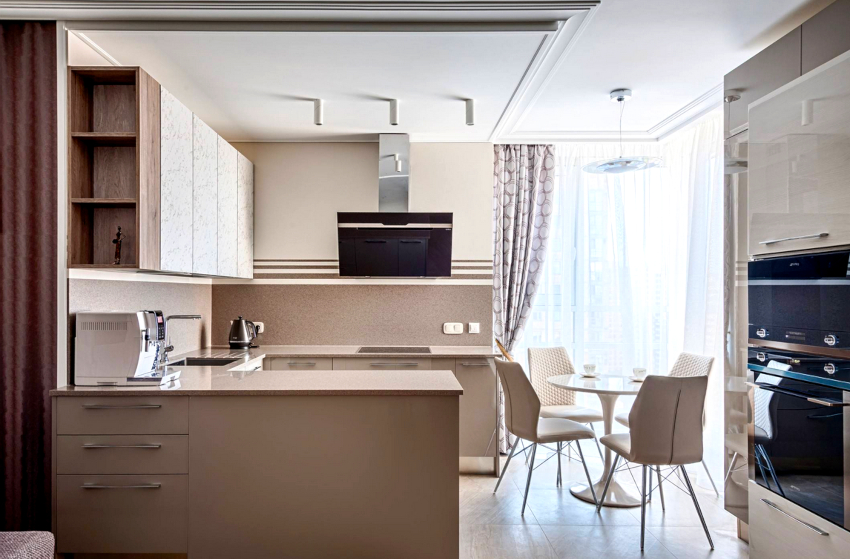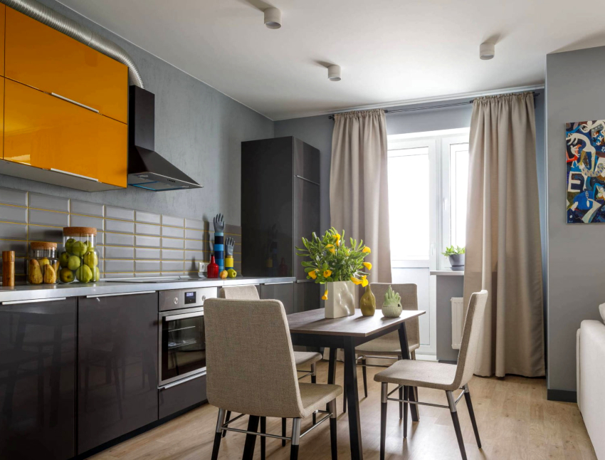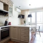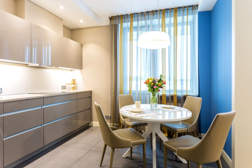 Curtains for a kitchen with a balcony differ in different designs, for example, curtains on eyelets, hidden or decorative hooks stand out. The use of fabric loops, which can be easily removed and put on the cornice, is considered popular. There are models with a motorized lift mechanism that rolls the curtains into a tube or folds them. In a kitchen with a balcony, you can also use a combined version of curtains, when one side is long, and above the window, on the contrary, is shortened.