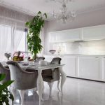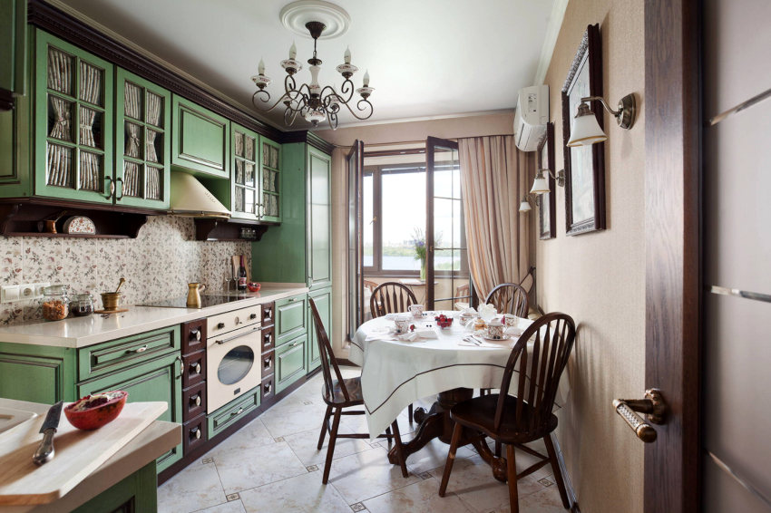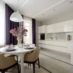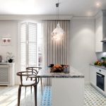 In addition, it is necessary that these textiles match not only the style, but also the functionality of the space. If the option of designing a kitchen in a classic style was chosen, then in this case it is appropriate to hang lush double curtains, complemented by tulle, which occupies the entire width of the opening, and thick curtains decorated with hooks along the edges of the product. It should be borne in mind that if the balcony door often opens, then this option is not recommended, because when entering the balcony it is easy to get confused in them.