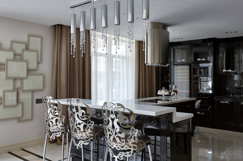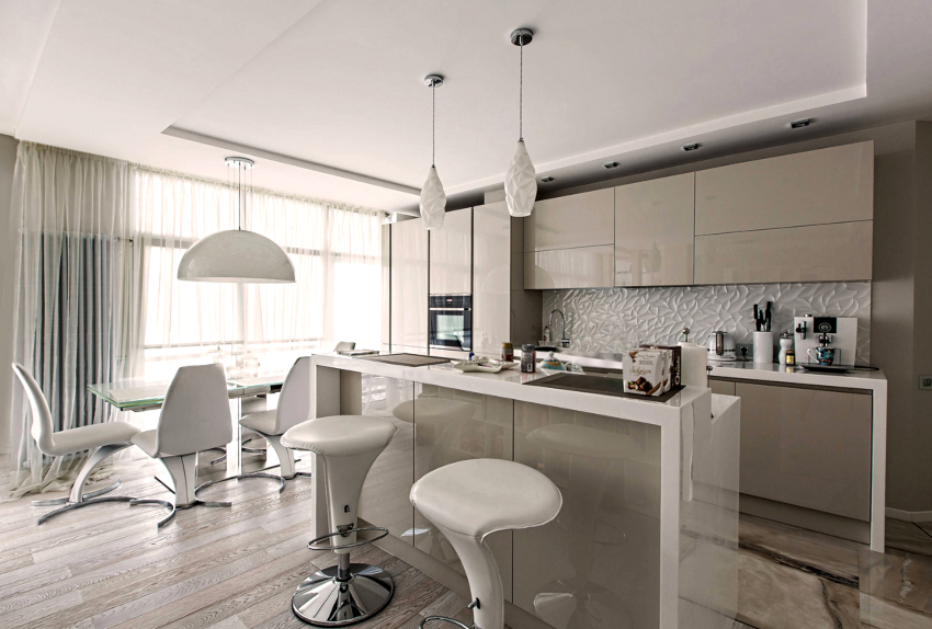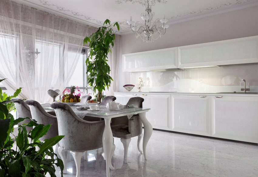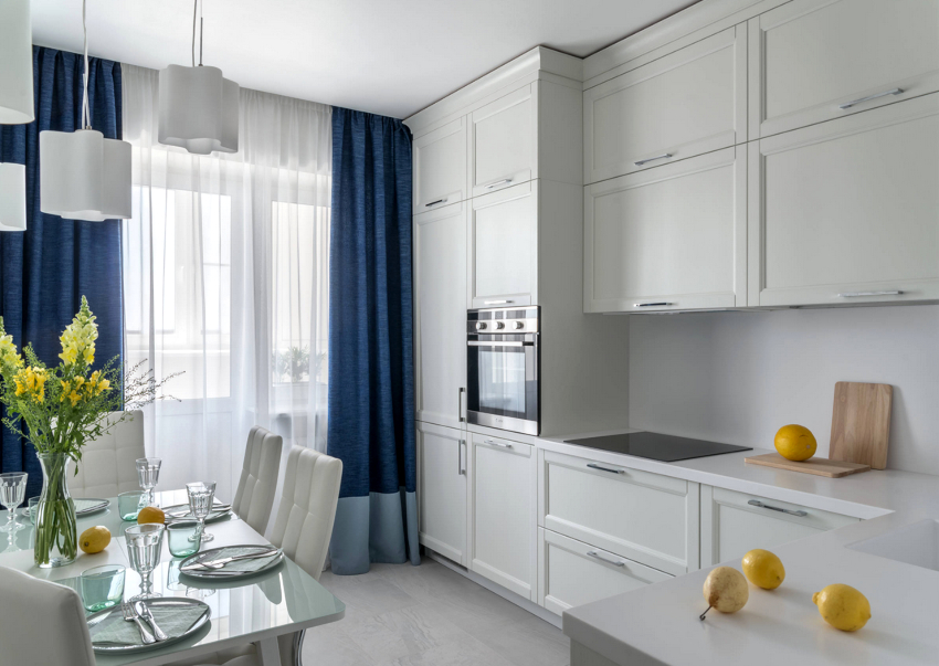 - In the photo of the curtains for the white kitchen, you can see how the silver textiles are harmoniously combined with the facades of kitchen appliances and chrome fittings.