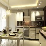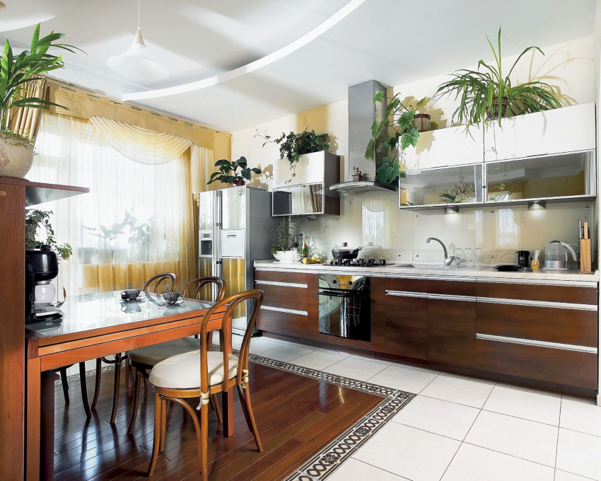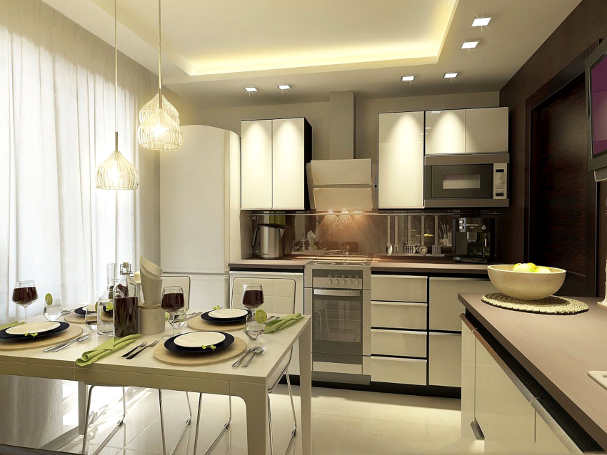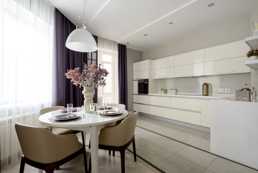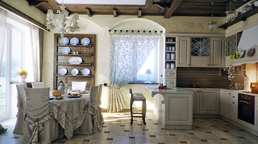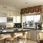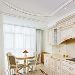 Correctly selected curtains and curtains allow you to adjust the size of the window, hide some imperfections and even slightly change the configuration of the kitchen space. It is important to understand that if it is planned to replace curtains in an already finished space, then it must be borne in mind that the presence of a stretch ceiling without the provided mortgage strip by the window does not make it possible to choose to install curtains ceiling cornice... The same problem can be encountered with plasterboard ceilings that were not designed to accommodate a curtain rod with a heavy curtain.