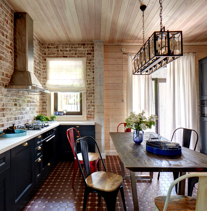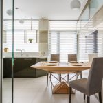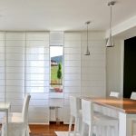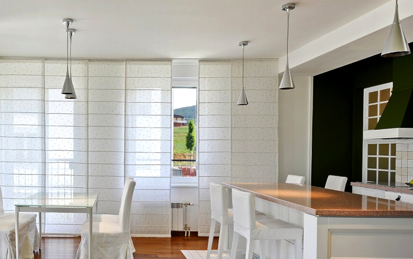Useful advice! Japanese curtains installed above the top window edge help to visually raise the ceiling height in the kitchen.