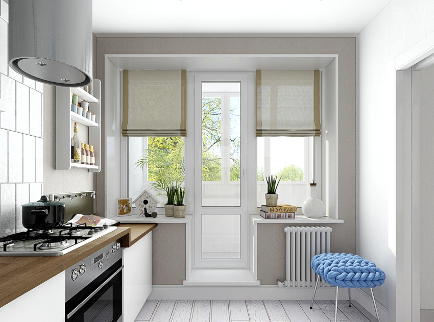Curtains for the kitchen with access to the balcony should be chosen so that they look the same and do not split the window into two separate zones