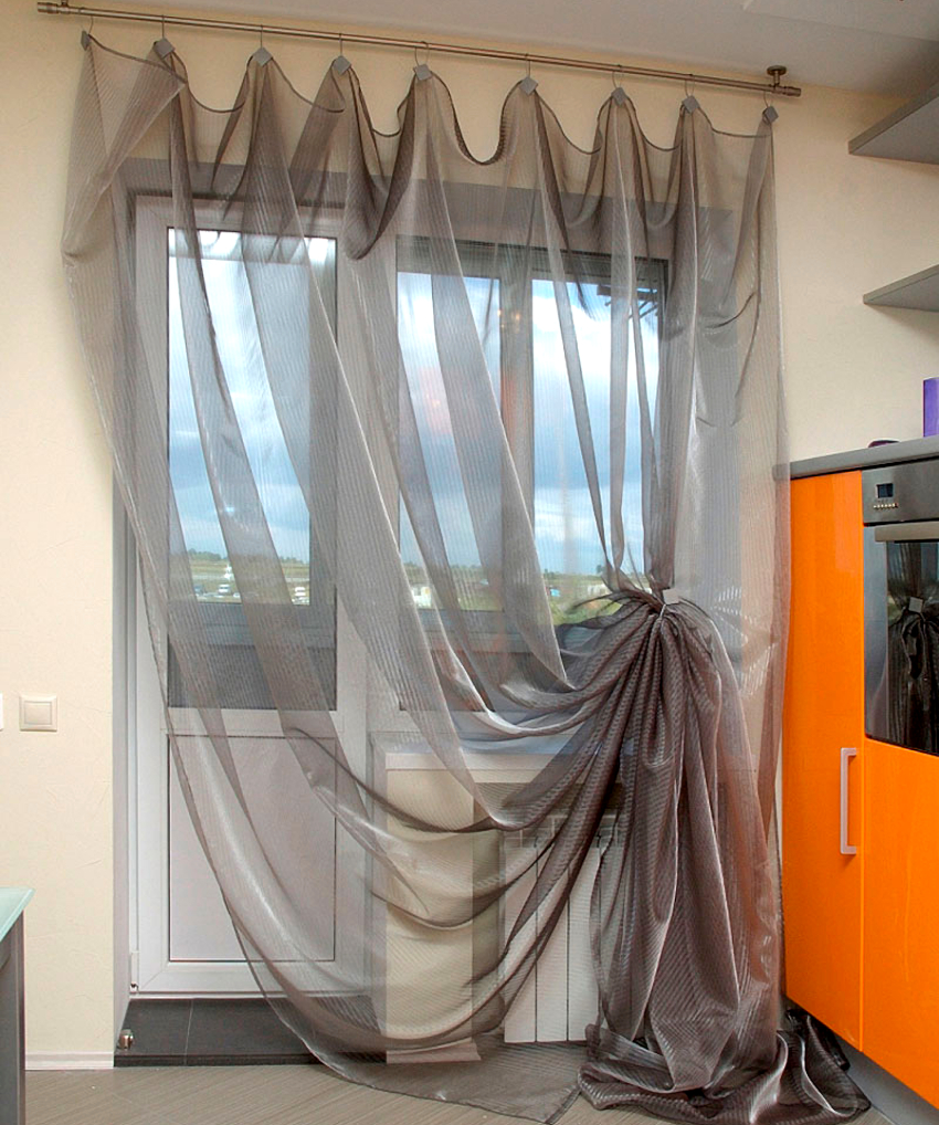 Correctly selected curtains for the kitchen with a balcony door are able to correct the shape of the window