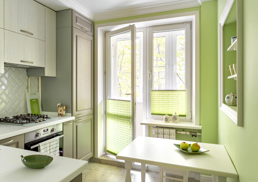 In advance, you should determine the design of curtains for the kitchen with a balcony, choose the optimal color and density of the fabric. When choosing textiles, you also need to pay attention to whether the curtains are treated with special fire-fighting agents.