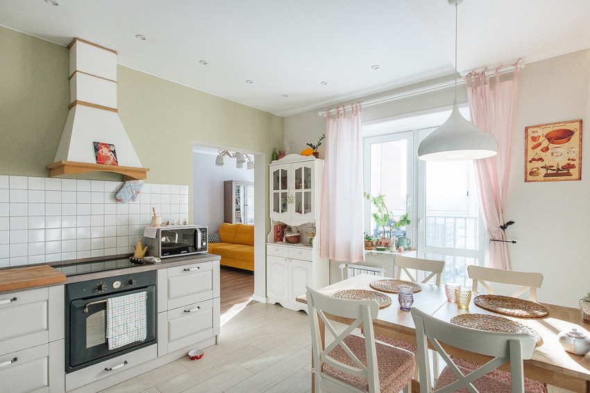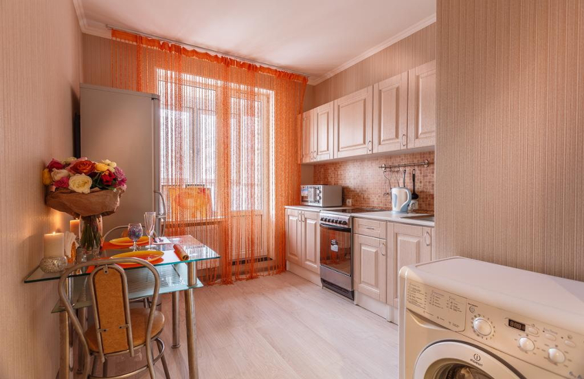 - It is always considered a winning option to use curtains in a kitchen with a balcony that have a light or neutral shade. Beige, sand, peach and dairy products look good.