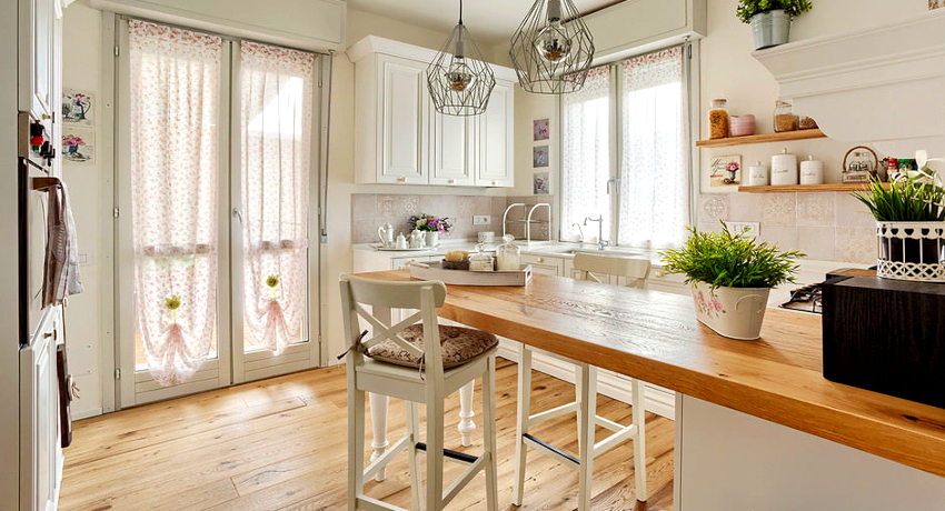 The choice of fabric for the kitchen, located on the south side, should be approached more carefully. In addition to the fact that curtains should not fade, it is necessary that they provide additional protection from excessive amounts of light.If a kitchen with a balcony is of considerable size, then it is better to choose dense fabrics for this purpose, which will create coziness in the room and emphasize the style features.
