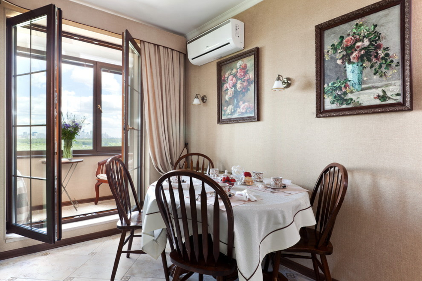 When choosing curtains for a window with a balcony, it is important to ensure free access to the door, because this room is either used for storing household items, or plays the role of a recreation area where chairs and a small table are installed. If the size of the balcony allows, then in the warm season the dining group is completely transferred there.