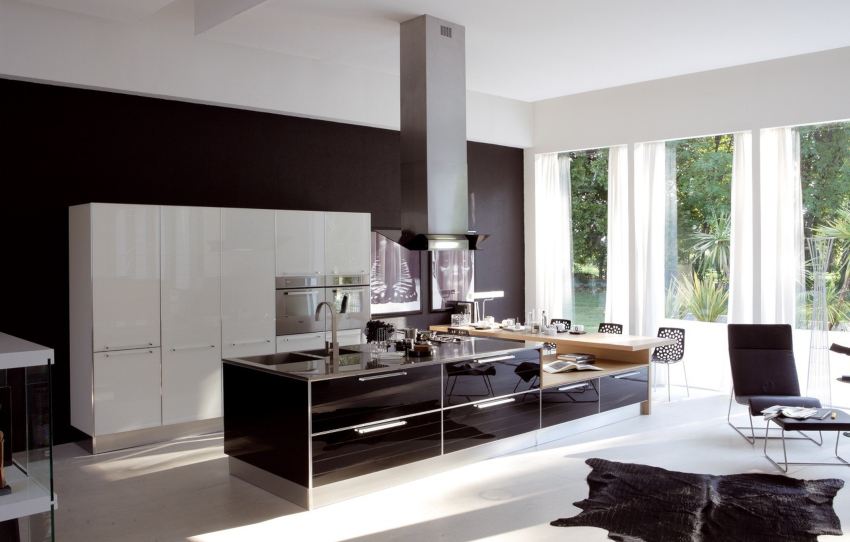 - If a monochrome interior is used to decorate the kitchen space, then curtains can be used as a bright accent element, but you should not use bright acid colors.