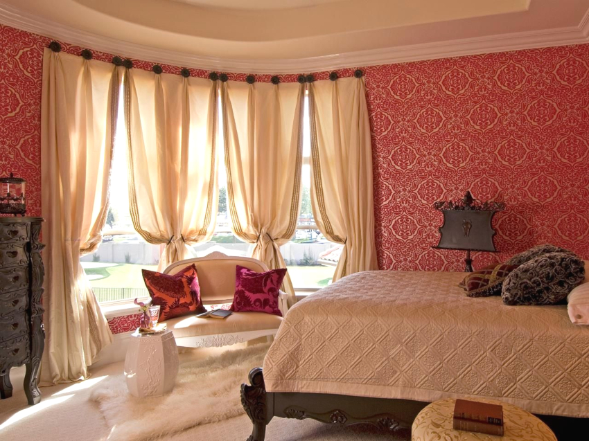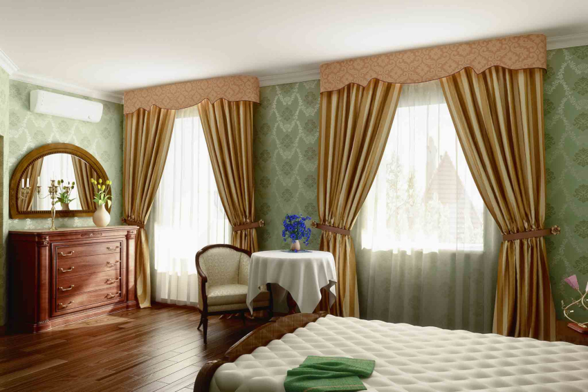 If there are piers between the windows of the bay window, it is better to use one cornice and a lambrequin along its entire length. Photos of bedrooms for viewing by those wishing to arrange windows in this way will prompt not only the type, shape of this decorative element, but also its optimal dimensions.