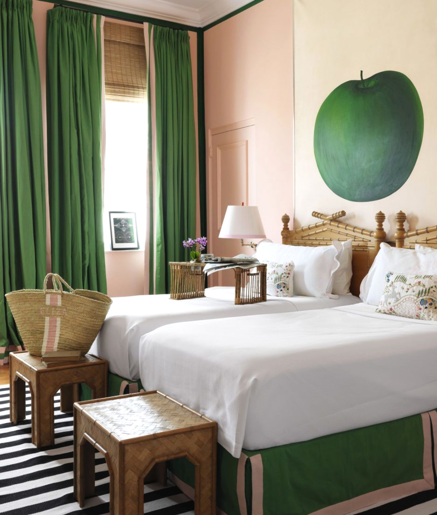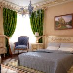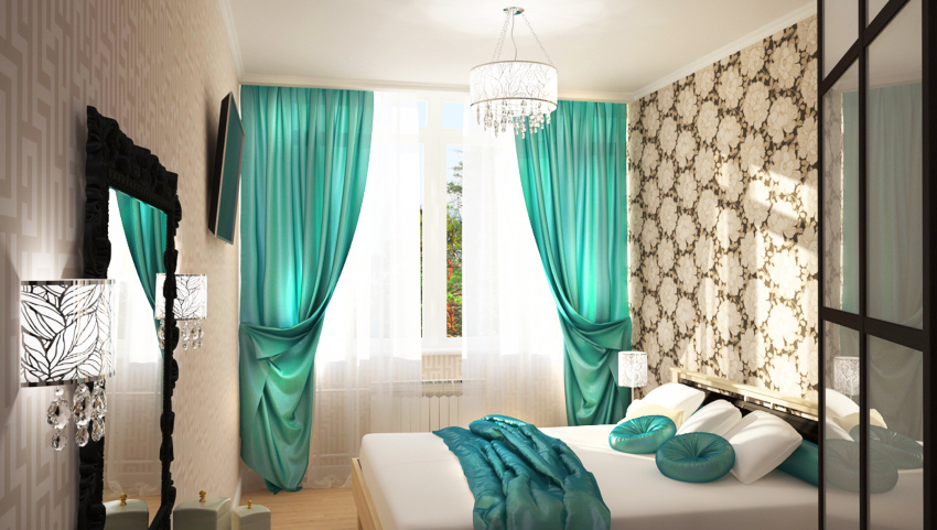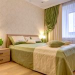 The curtains of the bay window are most often large canvases. In this regard, there may be a problem with the choice of color. The continuation of the hue available in the design carries the danger of signs of monochrome. A significant difference can visually isolate the area. The problem of the complexity of the choice can be solved by green curtains in the bedroom. The shade should be chosen depending on the size of the zone: the smaller it is, the lighter the tone. Curtains can be combined with indoor plants, minor details of a similar color on pillows, bedspreads, wall decorative elements.