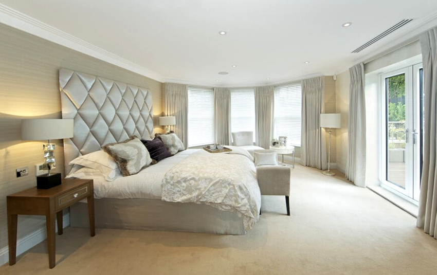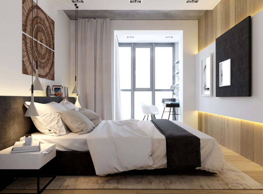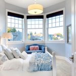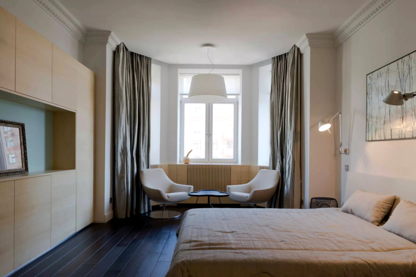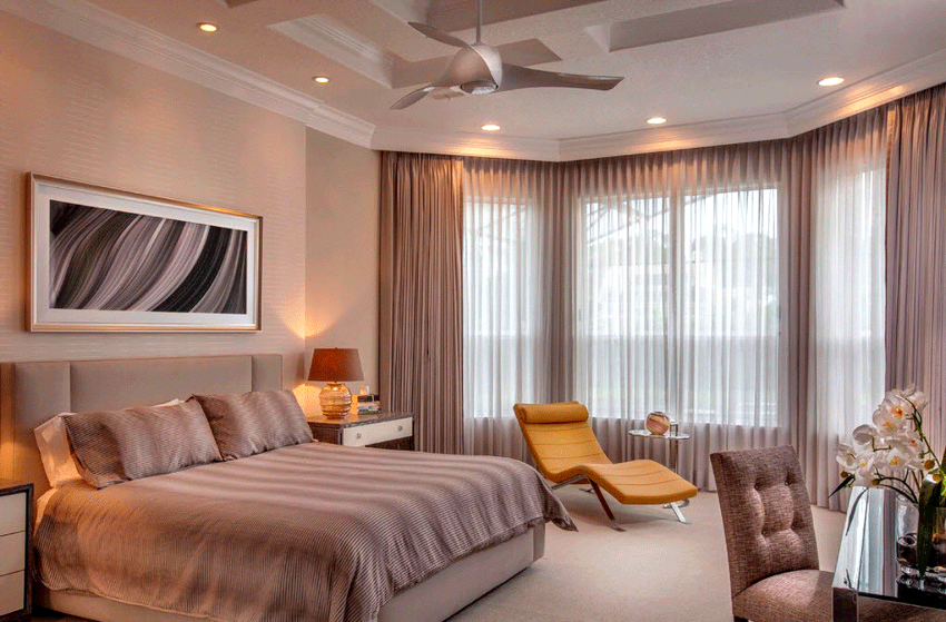 The bay window area in the room, including the bedroom, is an additional footage, special lighting and decoration. Bay windows are a decoration in themselves, therefore it is necessary to choose the option of curtains so as not to spoil the interior. The functionality of the zone is crucial. If a sleeping place will be located there, some accents are made, if the area for work or reading is different.