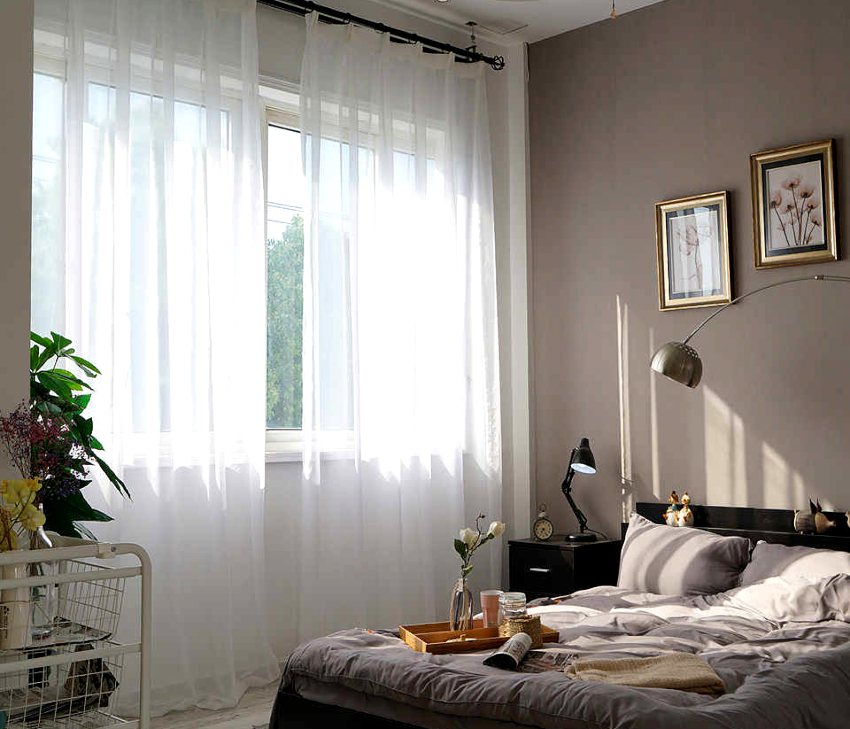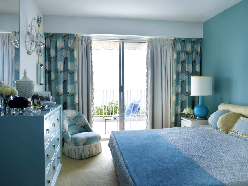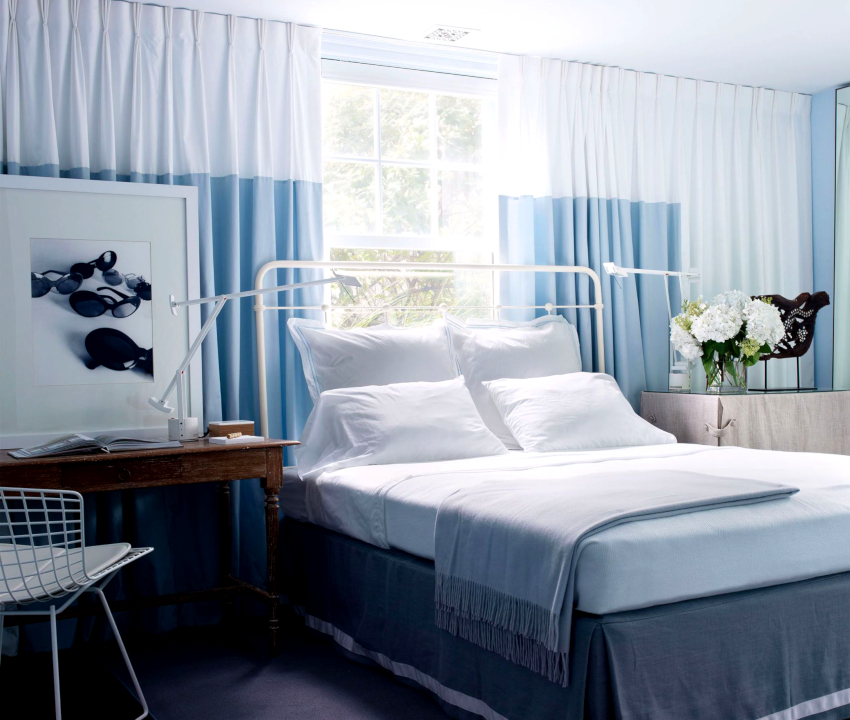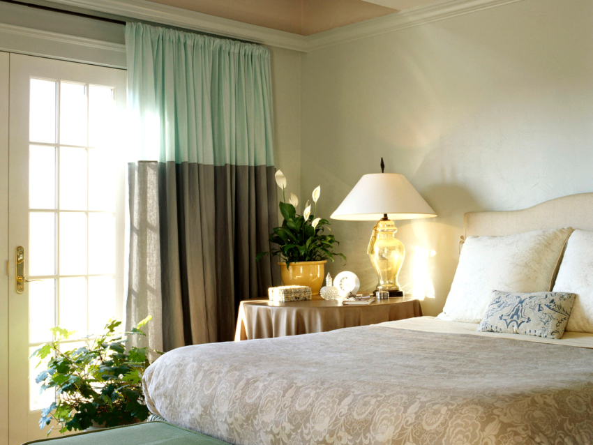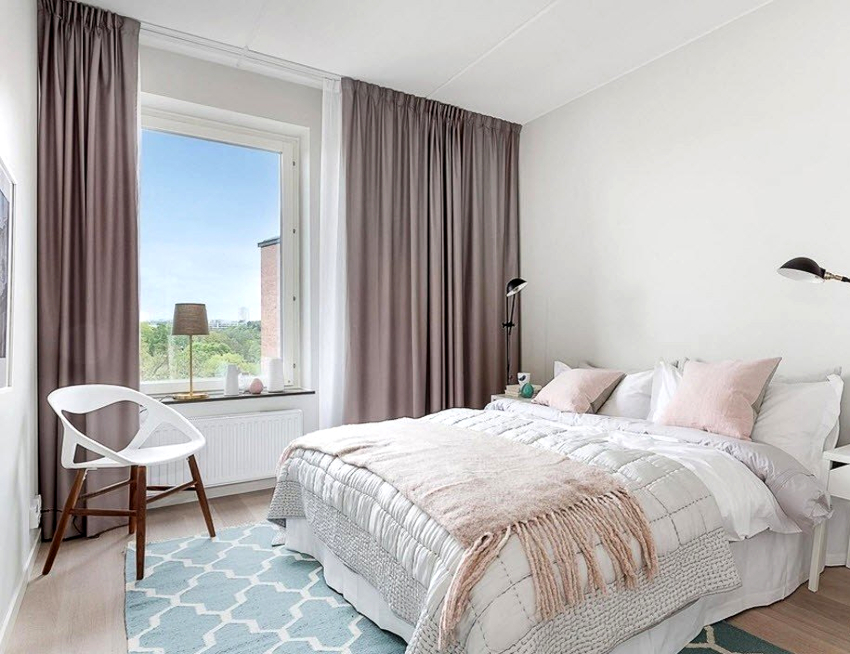 If the bedroom area does not need any expressive addition or white enhancement, it is better to use curtains in soft and light pastel shades.