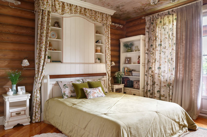 Curtains in a country interior suggest the presence of a pattern, and often quite large (the choice is determined by the size of the room - a large pattern will not work for small bedrooms). Lightweight, natural fabrics. Frills, ruffles, hooks can be an interesting addition.
