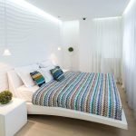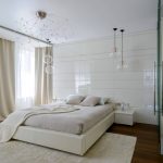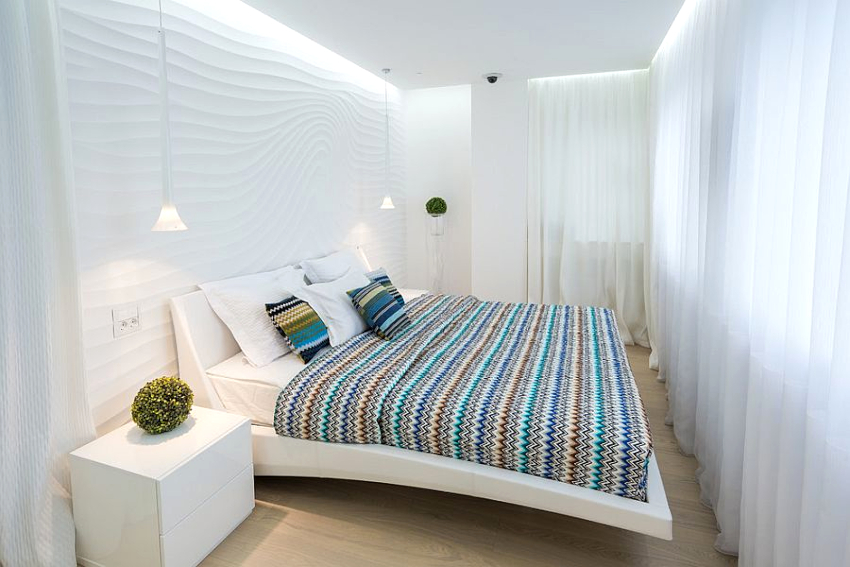 White is called a bedroom in which this color dominates, which means that the room has white walls and other interior details of the same color. Depending on how many of these elements are, the curtains can be colored or white. If there is a lot of white, then it is the window curtains that will bring lively notes. In this case, the shade of the curtains can be contrasting, but not bright, but deep, and also must be combined with other interior elements, such as flooring, upholstered furniture, wall panels, etc.